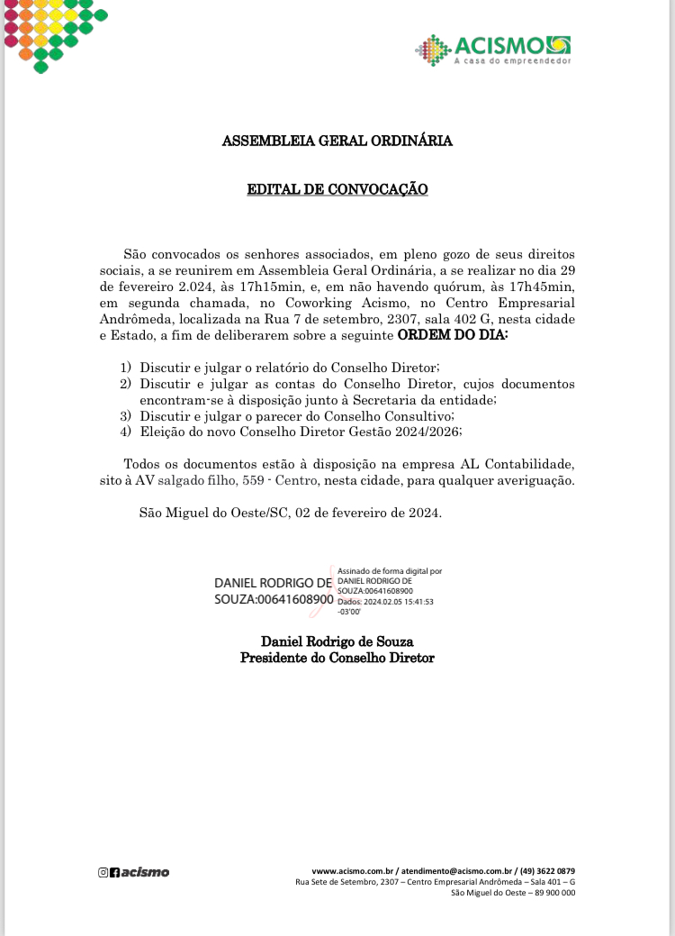 A Assembleia Geral, marcada para ocorrer no Coworking dependências da Acismo, a partir das 17 horas, reúne associados e membros da comunidade empresarial local para deliberar sobre a escolha do conselho diretor, uma instância crucial para a condução das atividades da associação e para o fortalecimento do ambiente empresarial no município.